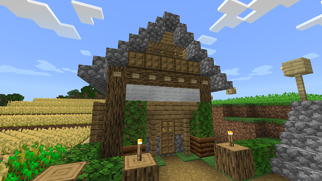 畑が発展してきて安定的に小麦とジャガイモが収穫できるようになったので、収穫した小麦とジャガイモを保管するための保管庫を作った。基本の素材は樫の木と羊毛と丸石です。建築初心者の3種の神器です。